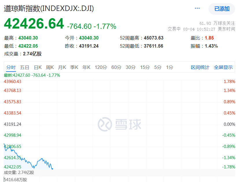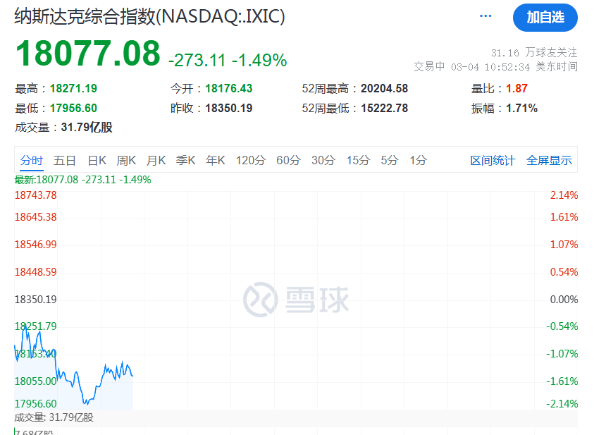 外地时光3月4日,美股收盘暴跌,道指跌近800点,纳斯达克指数、标普500指数盘中一度均跌约2%。