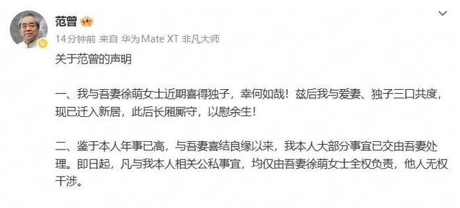 12月11日,范曾在北京参加活动并捐赠字画。这是他自8月“失联事件”后首次公开露面。会后,范曾先生接受了本报专访,并对当前情况进行了独家回应。相关报道:范曾关于范曾言论的认证微博截图 1、我的妻子徐萌女士,最近我们唯一的儿子出生了。这是多么大的祝福啊!我现在和我心爱的妻子和唯一的儿子住在一起,现在搬到了新房子。从此以后,我要和你一起度过余生! 2、鉴于我年事已高,自从与丈夫结婚以来,我的大部分私人事务都由丈夫处理。从此以后,一切与我有关的公私事宜,全部由我的妻子徐萌女士负责,任何人都无权干涉。 3、近期身边有人恶意煽动矛盾,无视我的名誉、健康和合法权利ts和兴趣。我感到无助和悲伤!有人利用范曾子女的名义“寻找、照顾”范曾,恶意捏造事实,公然诽谤我和妻子;还有人打着“范曾子女”的名义,以“保护”范曾为借口,直接或间接威胁我们一家三口的人身安全,严重干扰我们的生活。因此,从现在起,我将消灭范晓辉、范仲达及其家人,不再保持任何形式的联系。我本人也不再与上述两人及其家人,以及与其持有股份、管理、经营或有任何联系的公司和实体保持或继续任何形式的合作关系。同时,上述两人、其家人、涉及实体之间的任何信任、同意或其他契约关系将被终止和撤销。上述人员和单位不得再从事任何活动监督以我的名义进行的任何外部活动。我与上述人员及其实体的任何活动无关。我本人不会评论任何以我名义参与销售、展览、捐赠或任何其他活动的艺术品,但我有权追究法律责任。 4、今后我个人参与的一切公益和慈善事业只能通过北京世艺文化艺术基金会完成;商业运营相关事宜将通过拾一梵增(北京)文化艺术有限公司办理。我和夫人将继续为民族文化、艺术、慈善等活动尽一份力,积极履行社会责任。范曾2025年12月11日的照片显示了微博上发布的范曾笔迹分析。 “中国最贵画家”被指失联,四次婚姻多子或引发继承问题。中国87岁“8月16日,“最佳生活画家”曾某被传与女儿失联。这一消息随即在热门微博上疯传。范小慧在微博发文称,父亲被新婚妻子徐猛从住所带走,失去联系。住所被查封,仓库里的宝物被搬走,部分老员工被解雇,徐猛威胁员工不得泄露信息。父亲早年囤积的大量字画、古玩藏品,全部装箱发货。此时,距去年4月10日范曾宣布年长他50岁的徐猛即将步入第四次婚姻,就在今年7月5日,曾某在碧水庄园豪宅庆祝87岁生日的粉丝视频在网上曝光,老人脸色红润,没有任何变化,与第四任妻子徐猛的婚姻令人震惊。艺术界的“灾难”。去年,范曾再婚的消息引起社会热议。外界曾以为80后的徐萌以“医术师”的身份接近80多岁的书画大师,直到结婚。婚后,她的新丈夫接管了范曾的工作室。对于一个患有脑梗塞的老人来说,无论是真爱还是现实算计难免会引起质疑,去年范曾宣布结婚消息时,他写道:“我深爱的妻子南丽已经去世快三年了。起初是因为悲痛和悲伤,也因为脑子里的一点关怀,让我对中华文化的伟大传统做出了更多的贡献,并结下了深厚的友谊。去年9月,范曾与妻子徐萌公开现身中国美术馆,并一起参观画展秀恩爱。一家“艺术商店”“y”成为女儿失踪的消息,公众不免担心书画大师的人身安全。范晓辉说,自7月5日父亲生日以来,他因陪孩子去暑期学校而一直不在家。期间,他通过微信联系父亲,被告知徐萌女士身体不好,父亲陪他去医院,暂时不会再回碧水庄园。“我曾有过别人的怀疑”那时。我的父亲已经八十七岁了,仍然需要照顾。他将如何陪伴医院里的病人呢?但我选择相信。随后,徐猛在微信中表示,自己还没有得到治疗。后来我给父亲关系好的朋友打了电话。范晓辉刚回国,就收到朋友在网上举报的父亲失踪的消息。当他去父亲居住的碧水庄园调查时,他发现房子的门关着,封着,楼里空荡荡的。家里只剩下了为父亲服务了十几年的厨师、丫鬟、保姆、礼宾,而徐猛则将他雇的所有丫鬟都带走了。一些比较懂事的老员工,却被徐猛以重重的价值观解雇了。没有提及他们要去哪里,也没有提及他们与留下的家人和员工一起做什么。他惊讶地听说,在父亲被赶出家门之前,徐猛曾多次趁父亲不在的时候,将父亲早年收藏的大量书画古董搬走。 7月13日,我父亲被徐猛带走,已经过去一个多月了。范小慧写道:“我的父亲就这样被徐猛带走了,作为一个女儿,我很担心。我给父亲打电话很多天了,手机都没开机,我还是没有送父亲。我很想念父亲的健康和安全。当晚,范曾持股账户“范曾艺术有限公司”范曾的艺术品销售依然如故,不少网友涌向直播间租房询问。当被问及范曾的情况时,直播人员回复称有“失联传闻”。从商品链接可以看出,范曾的字画大多价格在几千元到几千元不等。当晚,范曾艺术有限公司的直播间仍在现场卖画。备受争议的“国学大师”,一代伟大的书画家范曾,1938年出生于江苏南通的一个书香世家。 1959年考入天津南开大学历史系。两年后,转入中央美术学院学习美术史,后转入中国画系。师从吴作人、李可染、蒋兆和、李柯uchan、刘凌苍等著名大师。 1962年毕业后,范曾分配到中国历史博物馆工作。 20世纪70年代末,他在中央工艺美术学院任教。后来,他组织成立了南开大学东方艺术系并担任系主任。范曾曾经与著名作家沉从文关系密切,他因在“文革