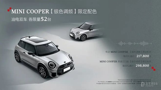【太平洋汽车新车频道】近日,MINI(最低价查询|查看详情)正式宣布,MINI COOPER银色调频限量版正式上市,其中电动MINI COOPER限时赠价21.78万起,燃油三门版MINI COOPER限量价08年起售价。两款车型均限量 52 台。同时厂家提供以下福利:12月31日前购车可享受36期零利息零首付或半购置税、4年/6万公里保养套餐(汽油版);首付0元起年利率4.28%,赠送6年畅悦保养套餐(电动版);新车在配置方面均采用Arace级标准,主要升级集中在外观设计和内饰布局上。从外观上来说外观方面,新车采用了闪亮的银色涂装方案,与车身和车顶的颜色相呼应,整体看上去呈现出独特的复古质感。内饰设计方面,汽油版采用了红黑撞色搭配赛车旗帜主题的饰面,并配备了与JCW车型相同的运动座椅;电动版首次引入全黑内饰布局,座椅材质为Vescin黑色面料,形成专属风格印记。动力系统方面,新车延续了现有的配置方案:汽油版搭载2.0T涡轮增压发动机,最大功率150kW,传动系统匹配7速湿式双离合变速箱;汽油版搭载2.0T涡轮增压发动机,最大功率150kW,传动系统匹配7速湿式双离合变速箱。电动版搭载峰值功率160kW的驱动电机,官方公布的纯电动续航里程为462km。 (图/文/摄:太平洋汽车潘洪瀚)